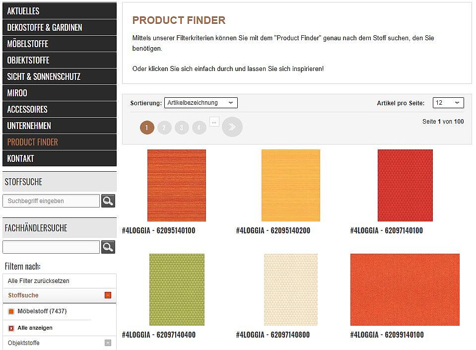 Mittels unserer Filterkriterien können Sie mit dem "Produkt Finder" genau nach dem Stoff, den Sie benötigen. Oder klicken Sie sich einfach durch und lassen Sie sich inspirieren!